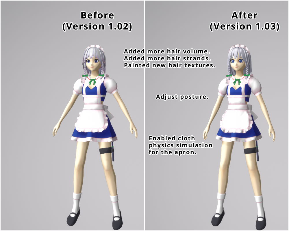 - Improved physics simulation for hair, skirt, apron, ribbon, frills, breasts.