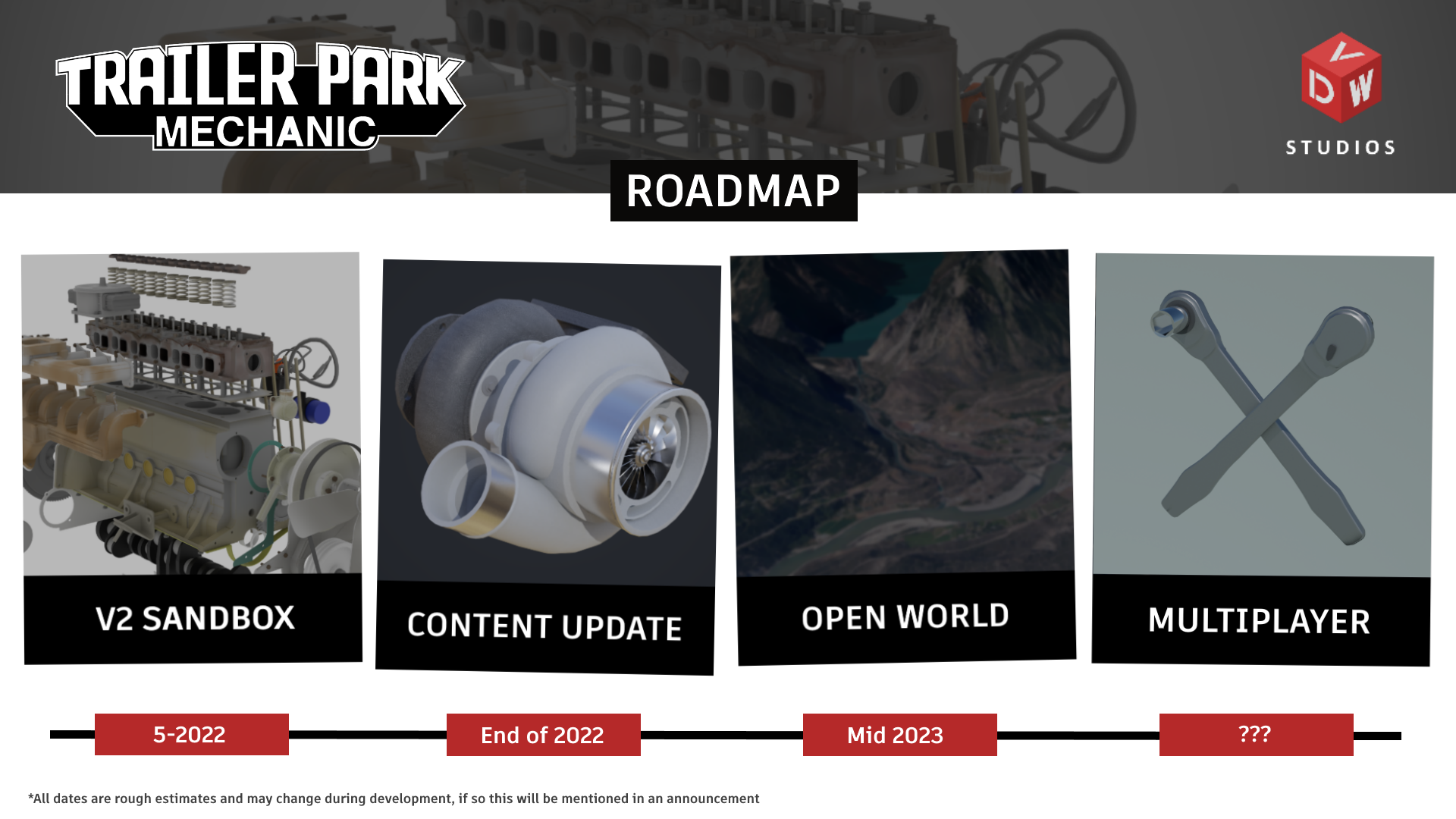 Since the takeover from Petrolhead software we've been very busy with the development of trailer park mechanic. To give all of you an update on development and when to expect upcoming content we've made a roadmap which we'd love to share with you.