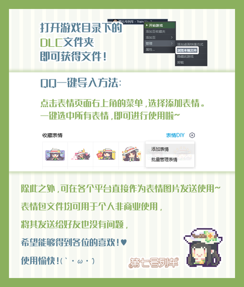 来自游戏作者的留言:各位玩家好!这里是游戏制作者“水野的四叶草”。《第七号列车》是我在2014年独立制作并且免费发布在互联网上的游戏,后因为游戏一直没有官方的页面及下载渠道,经过和“梦结界工作室”交流,在对游戏进行了部分Bug的修正及文本优化后委托工作室上架了Steam平台。如前所述,受限于当时的成本以及资源,游戏除了立绘及背景是与“真名”及“九尽”两位画师合作后委托其二位完成外,剩下的BGM(在后续会有说明)、RGSS脚本等是使用的免费素材网站或代码作者提供的公用资源,这类素材大部分都仅供用于非商业作品中,所以在权衡之后,为了保留作品的风格不变,我们没有对素材进行替换,而是决定在Steam上免费发布,任何人都可以免费玩到该游戏。游戏的剧本、玩法和表现形式甚至是窗口大小可能都受制于年代性以及引擎性能而不太符合今日的主流趋势,但游戏在正式上线后游戏却获得了意料之外的热度,在此非常感谢各位的认可及支持!我也非常开心能制作这款游戏!再次感谢每一位玩家对游戏的支持,愿您享受到了一趟惬意的旅途! 关于游戏的DLC:我们委托了工作室的成员“一粒像素_”绘制了游戏主角即列车少女的像素表情包,并计划将其作为游戏的付费DLC,定价为6r,供有意向支持游戏的玩家下载。DLC页面将在近期发布~敬请期待! 关于后续的其他语言版本:本游戏曾进行过日文版本的制作。后续也有计划在steam上架,供更多的玩家下载体验!我们将在正式上架时进行相关的通知与宣传!感谢支持! 关于游戏bgm的说明与下载方式:《第七号列车》的BGM均来源于音乐素材网站「Dova-Syndrome」和「あおいとり」,根据素材网站的条约规定,制作方无权二次向各位玩家发布音乐源文件。在游戏根目录(Steam中右键点击游戏,选择“管理→浏览本地文件”)的Audio/BGM文件夹中有一张名为“list”的图片,该图片列明了游戏中每一首BGM的原名、作者以及来源网站,烦请有需要的玩家在上述网站中根据名称自行搜索下载原音质的BGM。水野的四叶草&梦结界工作室2021年8月28日