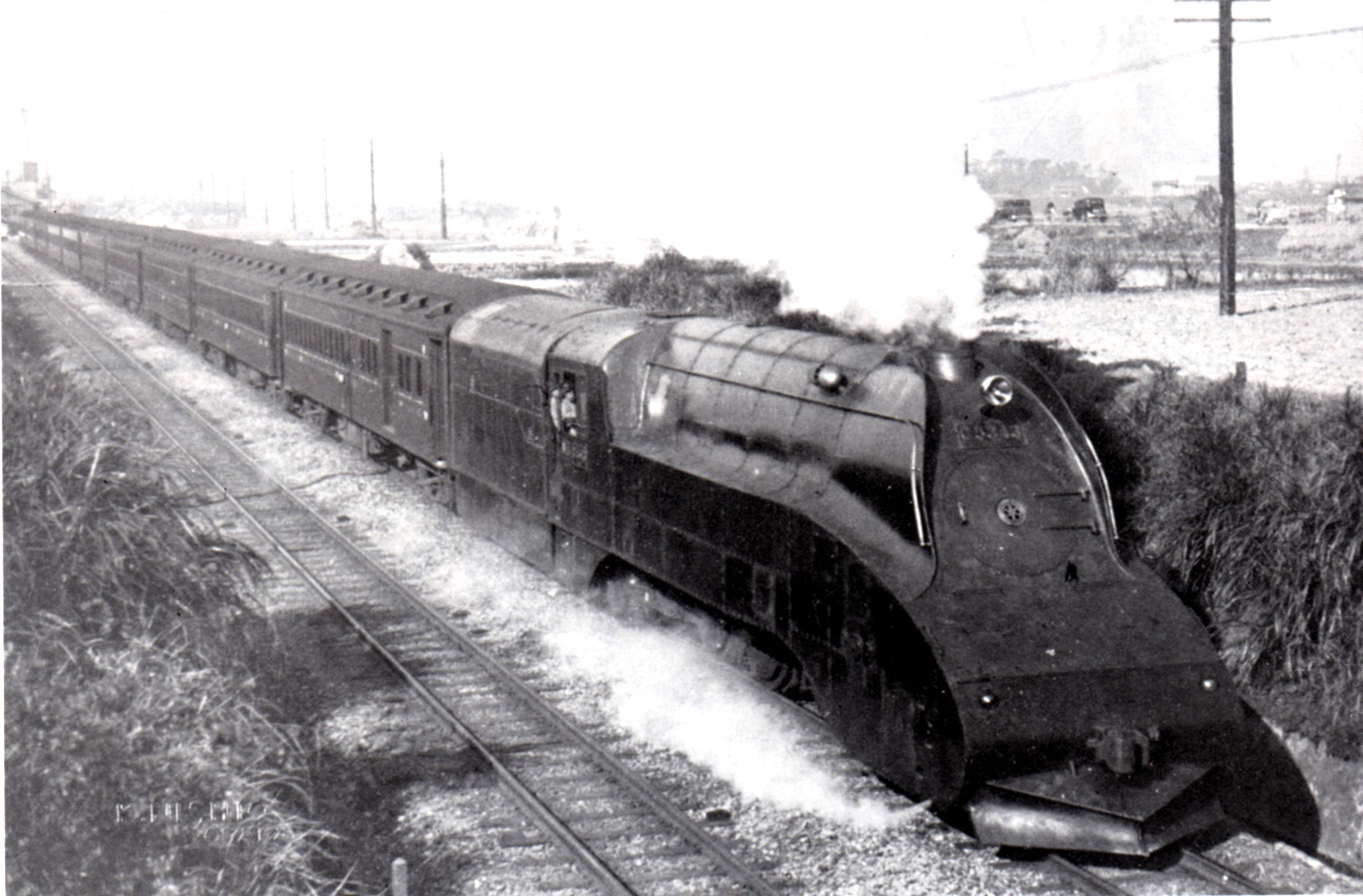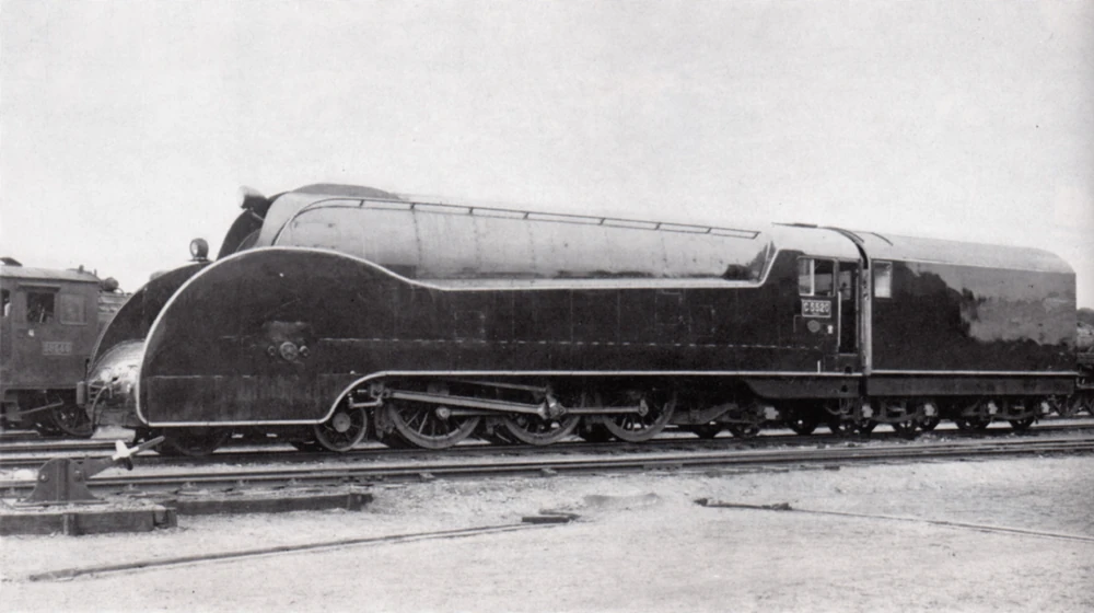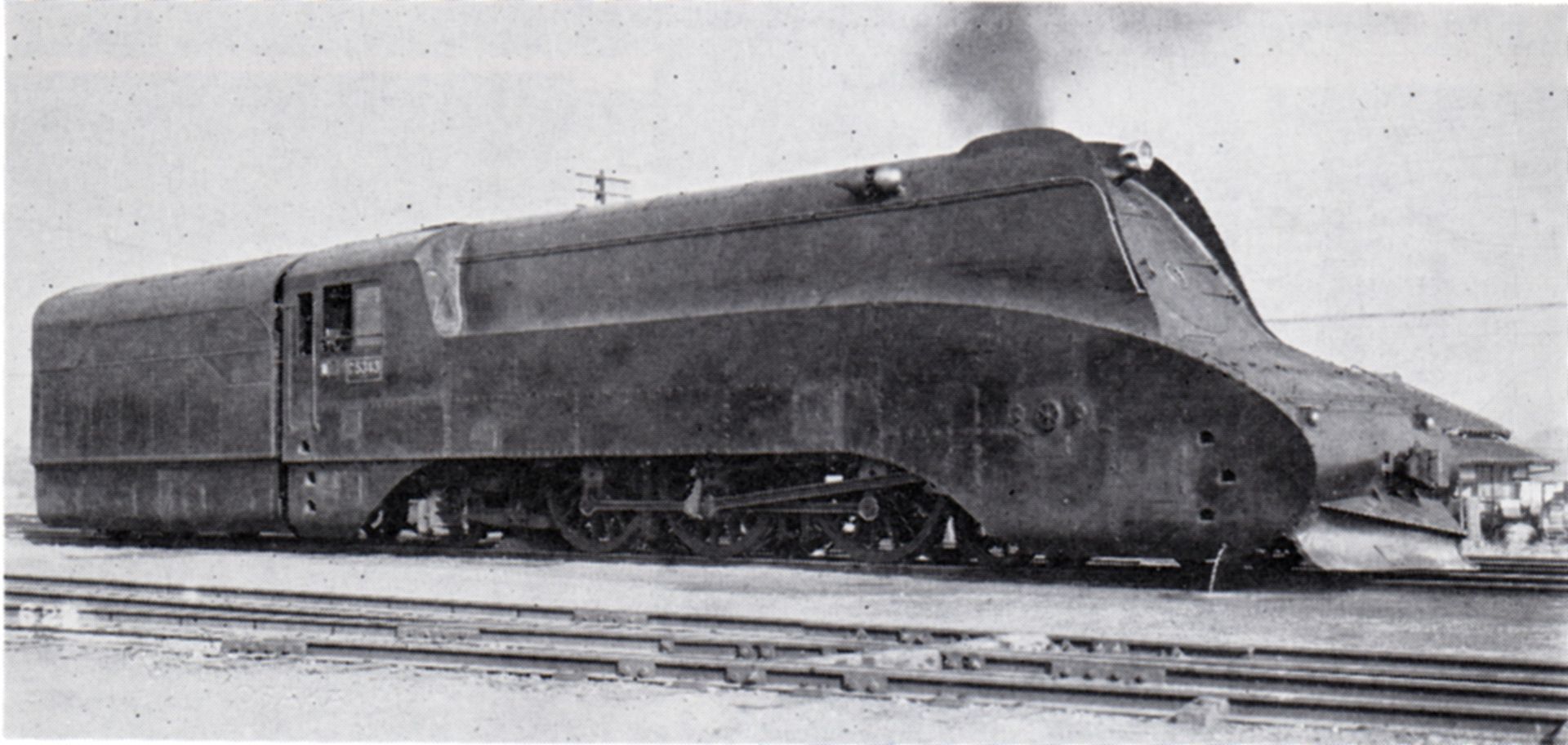 (C53 43 pulling the Tsubame train, photographed between Okubo and Akashi on December 9, 1934. Notice peculiarly similar approach to streamlining, even though the first A4, LNER 2509 "Silver Link" didn't enter service until 7th September 1935. - Katsusaburo NISHIO / 西尾克三郎 - Scanned from p.34 of "Railway Pictorial" No.426, from Wikipedia)