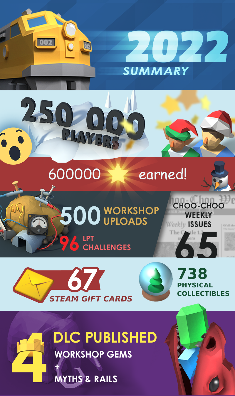 Here is to overcoming DNRT and DNUP, finding and selling overpriced scenery objects to fund an extra bridge construction, perfecting your Spider chocolate recipe, building a wiggly track section around reloading Pass Limiters, powering an entire valley with a Potato Power Plant, disassembling Alien Artifacts into Fish, Microchips and Snowmen, completing just one more train puzzle...or maybe two :)