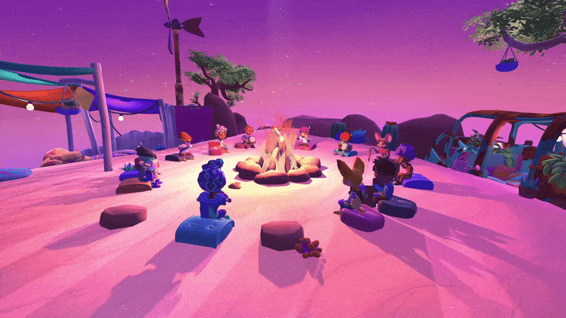 The camp is where you head when you join a lobby with friends (or soon to be friends) in Tray Racers! There you can customise your style in the changing room, make music together and most importantly pet Scrump, the resident… lizard-dog?!