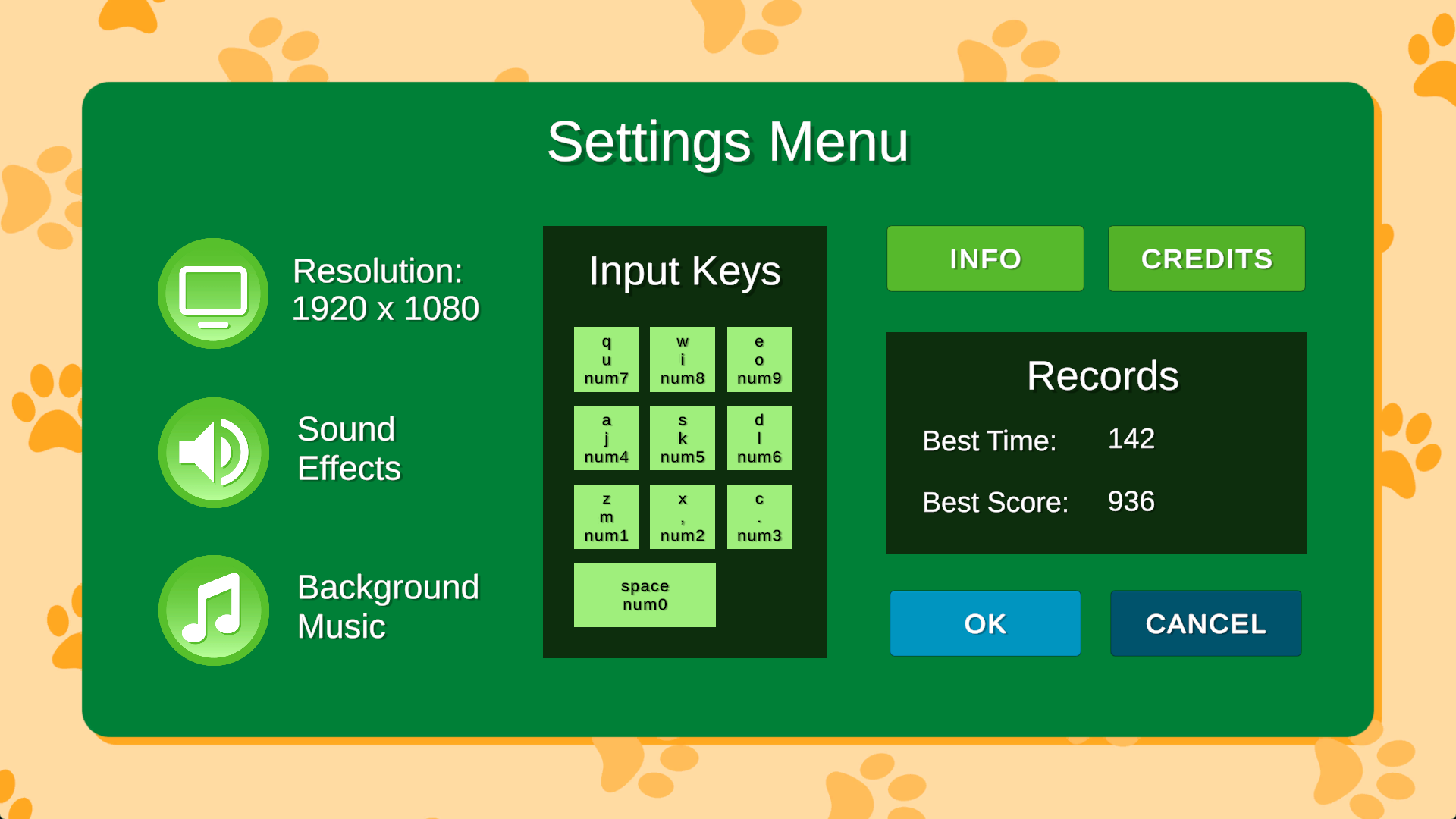 Hello, everyone! This update for Treats Please! brings the game up to version 0.9b and contains several exciting new features. A new settings menu now contains the options toggle buttons and a few other items as well. In the new menu, you'll find a resolution button to easily change the game window resolution, a records area to show your best time and best score records, two new buttons to view the game info and credits screens, and a diagram for how to play the game with the keyboard (in addition to the mouse).