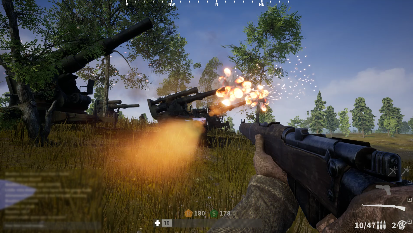 Changelog -Added muzzle flash to all weapons - Fixed audio - Changed the prices and Health of most buildings -Added some more destroyed meshes - Fixed mountable guns from firing on their own when dismounting. - Added one artillery and effects. - Added destroyed variant to artillery and the ability to repair. - Fixed terrain when mounting guns. - Fixed bullet trails. (We didn't realise their orientations were wrong all this time!) - Added bots to AI map. They target enemy HQs to move to, it's their only change (for now). - Tweaked health of some mountables. - Touched up some Hammer and Axe animations to look less weird - Fixed up the way shading was rendering on some weapons - Fixed the trenches position on complete build, and made sure it didn't interfere with tunnels. - Polished the nuke cannon more with some fallout effect logic. Particles / screen fx. - Tweaked fire rates for artillery, but it does need representation for loading times etc which doesn't exist yet. - The artillery being attacked by bots when destroyed should be fixed. - Removed "Kill me" text on game end. - Attempted to save frames a bit by reducing the particle effects that spawn when trees die by explosions. - Added a reset button to the input mapping screen of the exit menu. - The double exit buttons might be fixed now. - Fix to HQs built by players. They get assigned their team and show a number instead of A,B,C etc. The territories get updated again now. - Tweaked interactions to work better for clients. - Fixed interaction / repair / build UI showing when dead and in map screen preventing respawn. - Landmines now a thing again. - When repairing the nuke cannon it costs resources and gives back some money for the effort given. - When repairing structures, you now consume resources and gain money. - Added something I call Battle Influence to the conquest games. - Added Iron Ore minable objects (they give 50 supply per hit) Lowered tree resource gain to 5 supply per hit (was originally 10, subject to change) - Flipped team indicators to show only on allies with a green triangle instead of red. - Added point gain indicator system to when you repair, upgrade, build or destroy buildings, hit an enemy, gather resources or cause explosive damage. It's the thing that pops up when you kill enemies (but only the small text part). - Added new Nuke game mode to the host game options. - Made conquest UI only visible in those modes. - Added one brum to each side of the nuke GM map for fun. Tweaked a bit, but definitely not final product. Lol. - Heavily reduced the mounted MG recoil. - Tweaked explosion influence on terrain. Was a bit too severe before. - added SIGNIFICANTLY more optimised collision meshes for all trenches Made the SMLE a bit lower on the screen as it took up a lot of screen space - Made the 1911 hipfire animation recoil SIGNIFICANTLY less intense (no more spring-loaded wrists) - Reduced and smoothened out camera shake on cannon fire. - Crosshair hides on mounting cannon types. - Smoother terrain change on explosive crater creation. - Reduced jeep replication demand - Patched win conditions so the game ends when you hit zero points or if a team has zero HQs. - Made a bit nicer post game screen when game finished. - Added loading screen images to lessen the confusion when loading a bit. - Increased the priority of the HQs spawning on clients first so that they can spawn in faster when joining a session. - Rockets don't blow up in your face now. - Changed location of some UI elements. Health bar / stats and further reduced screen space impact of the chat window. - Nicer terrain transitions, no gaps and cracks! - Fixed double exit buttons on in-game menu. - Main menu apparently loads faster now. Mystery optimisation? - Tunnels are now invincible till destroyed mesh is created, etc. - Patched interact UI still showing after entering something as a client. - Bots are now "a bit" more responsive. They attempt to destroy enemy HQs if no enemy bots or players are around and should very occasionally throw grenades again. Touched up depth of field on all maps. - For the most part, bots seem to be doing a bit better. Touched up their targeting and abilities a little. - Fixed leader board bugs in post game and for host. - Fixed some more game end conditions for PvP modes. They were still getting stuck at a end game countdown which was looping on itself indefinitely. - Increased priority of exit menu UI so that it shows when you're in the post game screen. - Touched up mortar projectile arc and artillery arc. - Added ammo dump. - Added medical dump. - Projectile for client now replicates from further away.