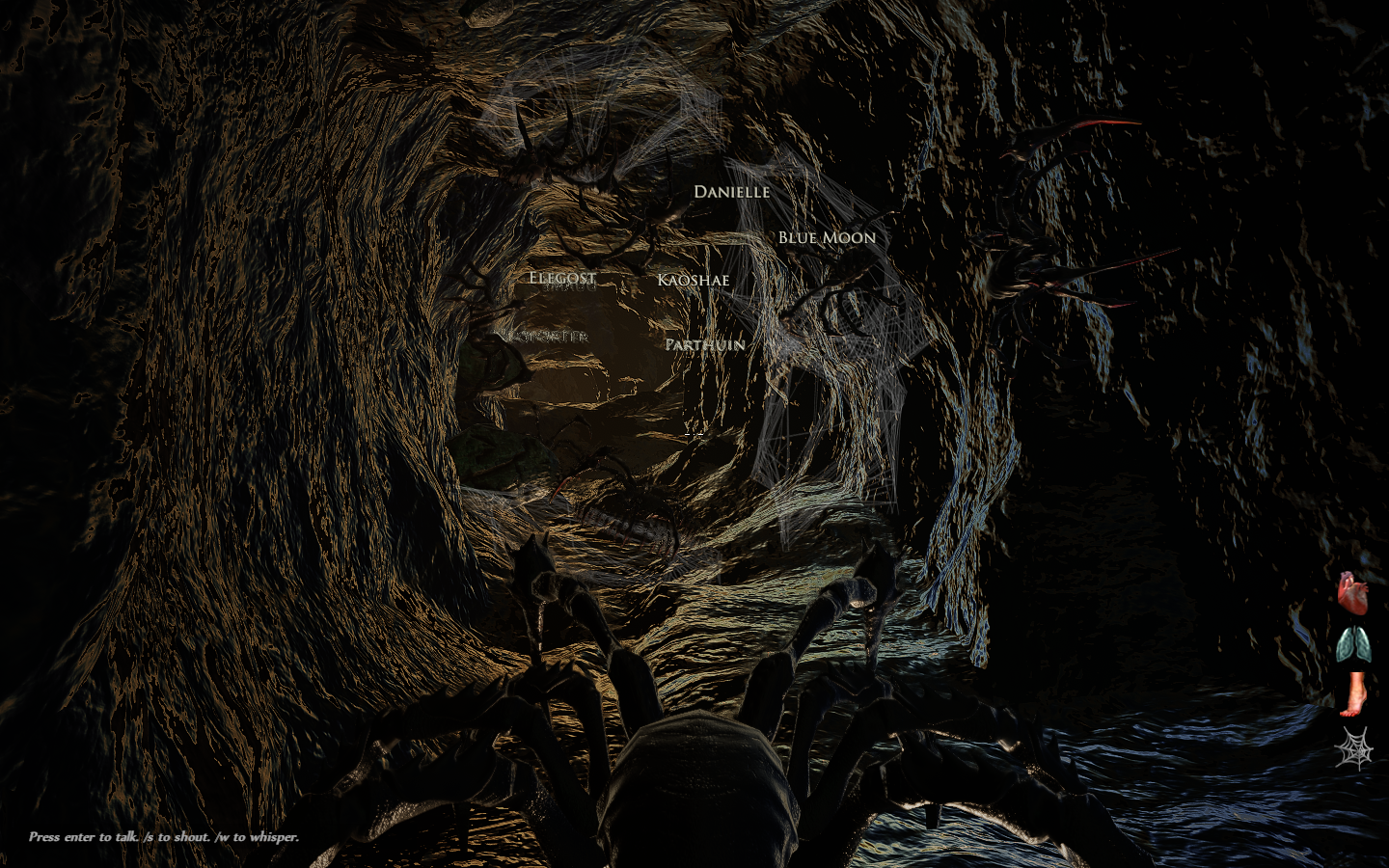 Raknar are ambush predators and as such their stamina drains very fast while sprinting. Fortunately their 8 limbs provide above average speeds for their basic movement. Their multiple sets of legs also allow them to traverse a multitude of terrains, including those that are inaccessible by the other races. This includes vertical surfaces like walls and inverted ones such as ceilings, both of which can be found in the caves under the island. They are especially well adapted to the caves, having access to a special night-vision that allows them to see in even the deepest reaches of the tunnels.