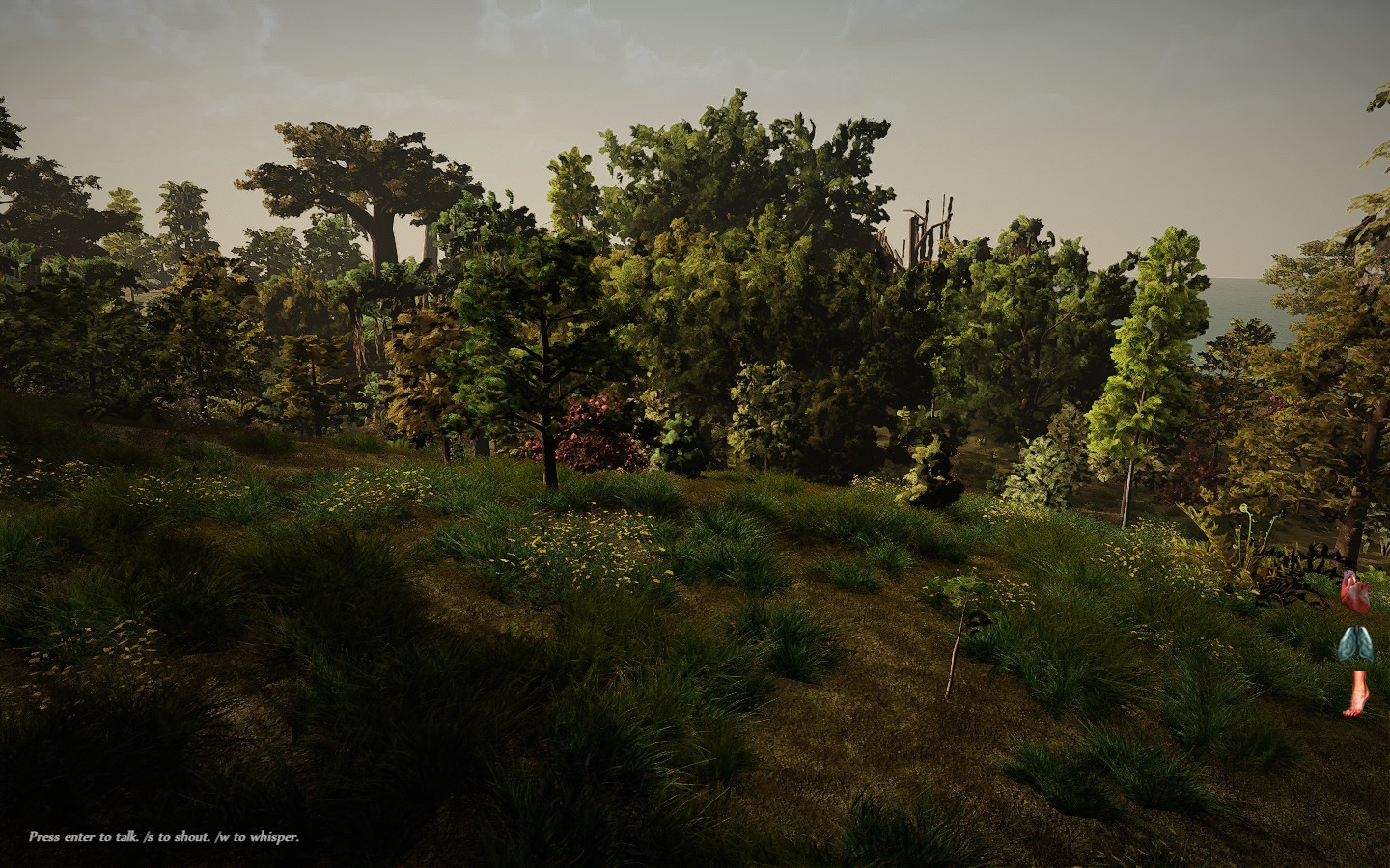 In addition to the various grasses, there are eight types of trees, six types of shrubbery, and six types of herbaceous plants currently in the game. All of these can be harvested for resources, or cleared out to make room for whatever the players have in mind. Many of them are food sources for the fauna of the isle and some are even edible for humans. But be careful, as some are poisonous and can negatively impact your character if consumed. Flora on the island dynamically spawns and expands in a natural manner if left to its own devices. It will spread, live, and die in a natural manner. Most plant-based resources regenerate on their own, though a few do require the destruction of the plant to harvest.