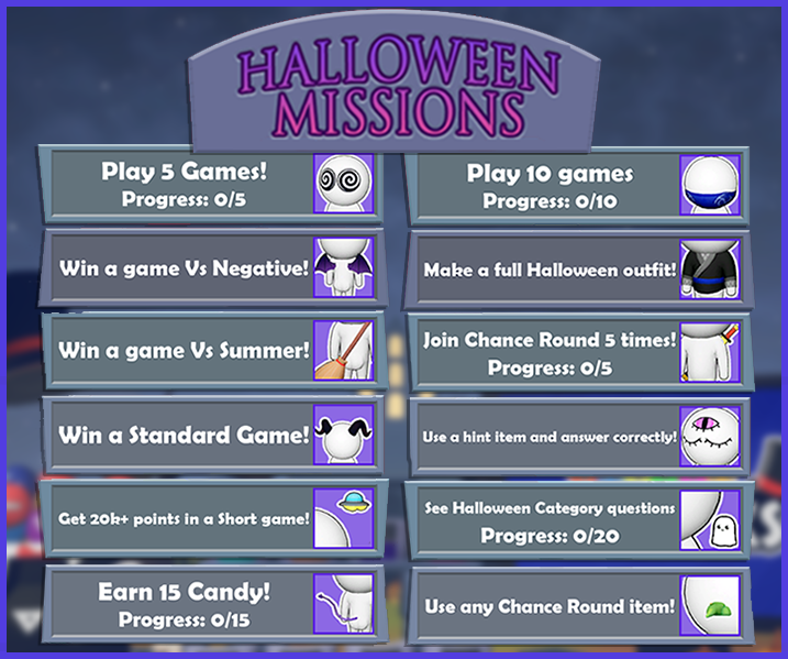 Everyone loves a spooky hat or two. Earn candy through finishing games of Trivia and trade them in for Halloween-themed cosmetics in the character creator! It's not Halloween without a costume!