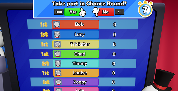 During the Chance Round phase you will now be prompted to join or decline at the top of the screen. Previously opting out meant waiting down the timer which could be a little awkward if nobody had the courage to risk it all. Once everyone has made their decision the timer will zip down to 0 and the Chance Round machine will immediately kick into action. Failing to make a decision will still default to not taking part - so don't fret if you can't decide in time. If you're playing with Twitch Chat then things still stay the same and they join how they have done before.