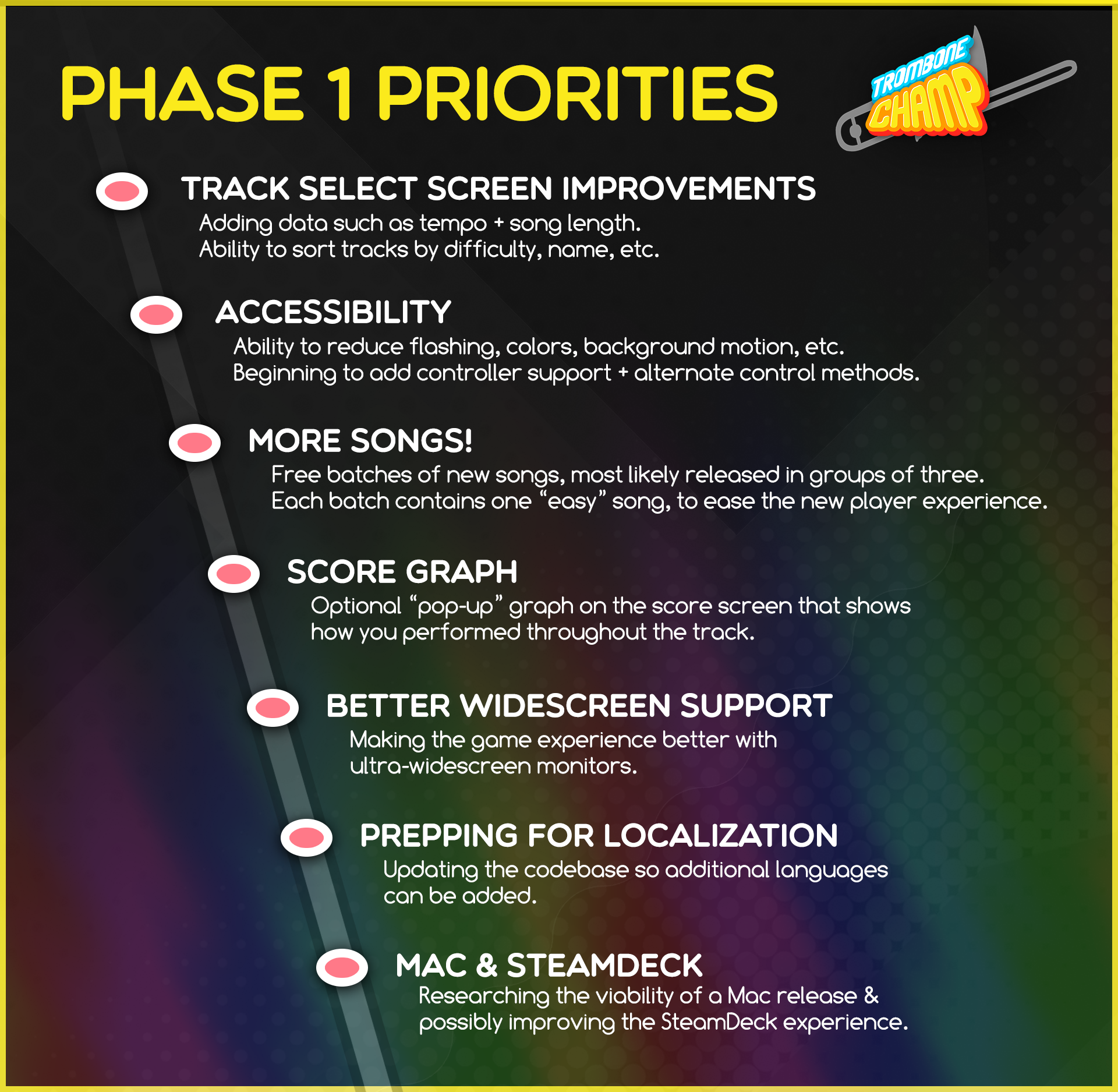 The above list is roughly in priority order, although we will likely work on many of these things simultaneously, and they may not be released in the order displayed above. Overall, we'd like to have everything above finished this year! Some of these things may be very quick (such as the ability to sort tracks in the Track Select screen), while others will be more gradual (such as prepping the various screens for multi-language support).