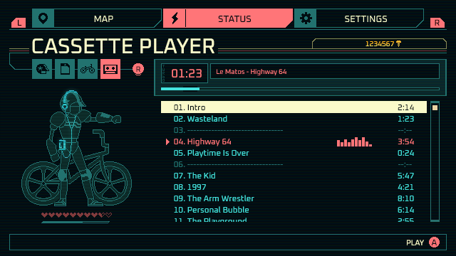 You are all in for a special treat in this final sub-screen reveal: The Music Player. Oh boy, your ears are not ready for all these heart-pumping beats curtesy of Le Matos. Collect all the audio cassettes throughout the game and listen to them here, featuring brand new music and some previously unreleased tracks.