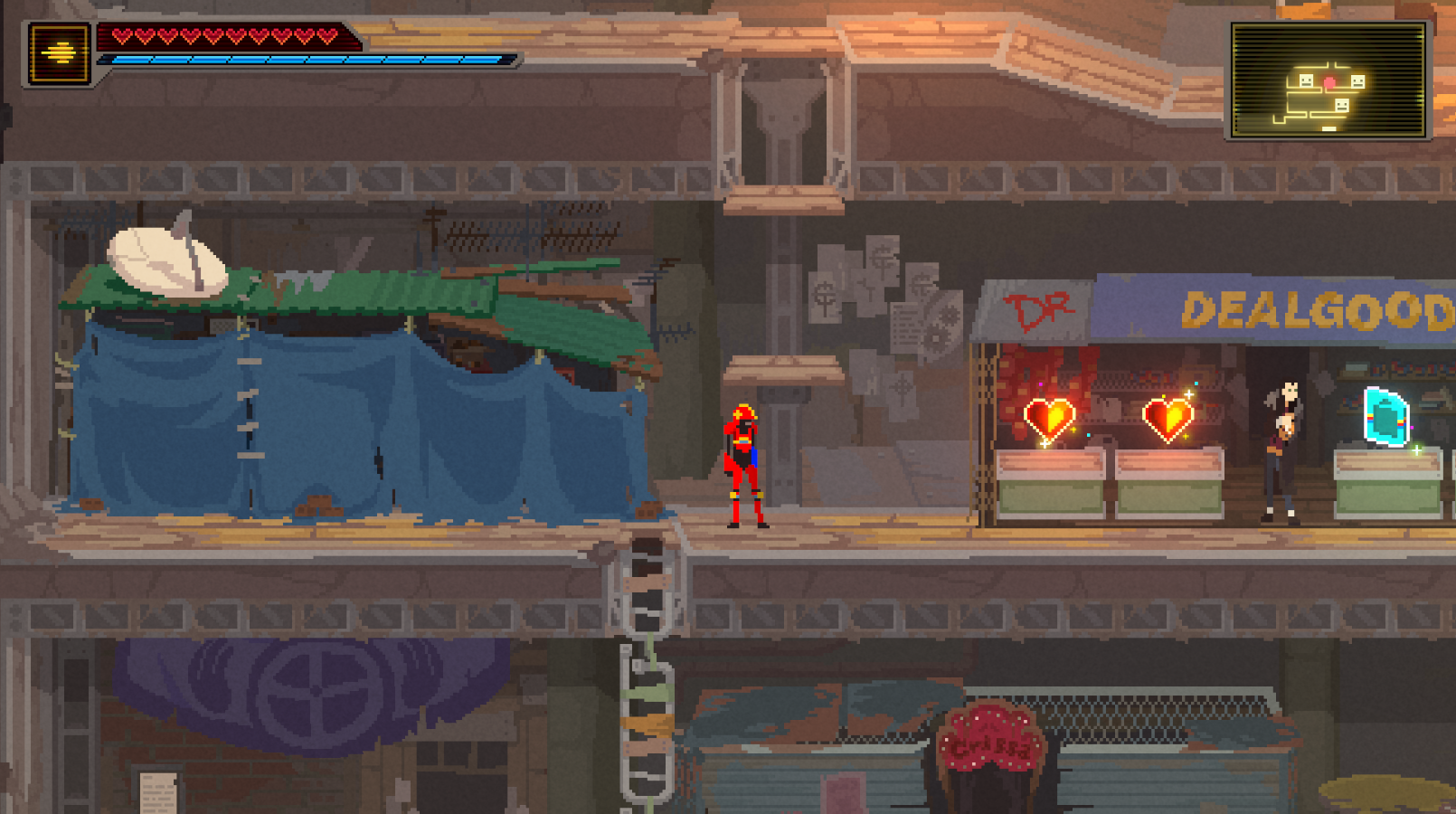 If you played the Demo you may be wondering what all those scraps you collect are for. Merchant Shops! You can now exchange your “scraps” for some nice rewards like health or energy upgrades and maybe even some cartridges (more on those in next month’s update).