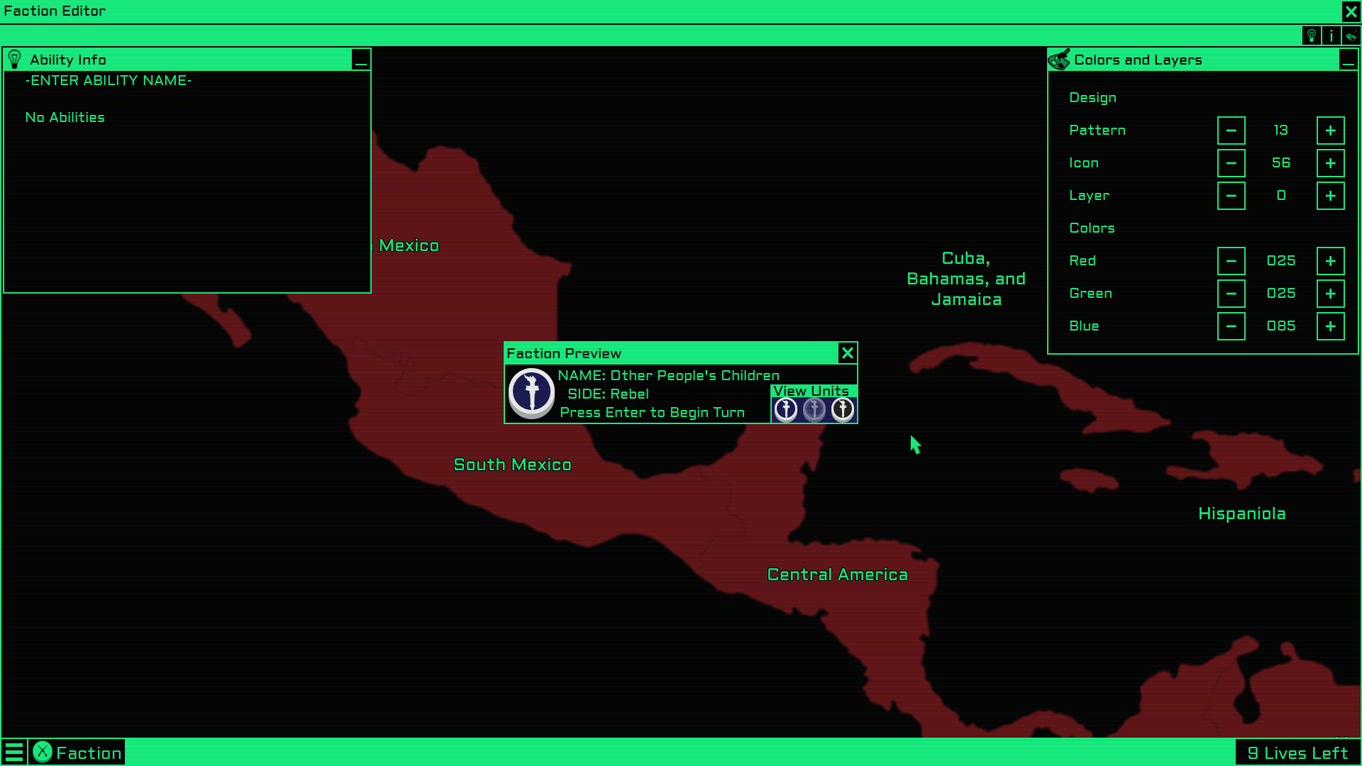 Then there's the Player Intro at the center of the screen. The wrong sprite was used to show the player info, and that led to the sprite from the Faction Creator being used. That has also been fixed. Also, the debug keybinds have been removed.