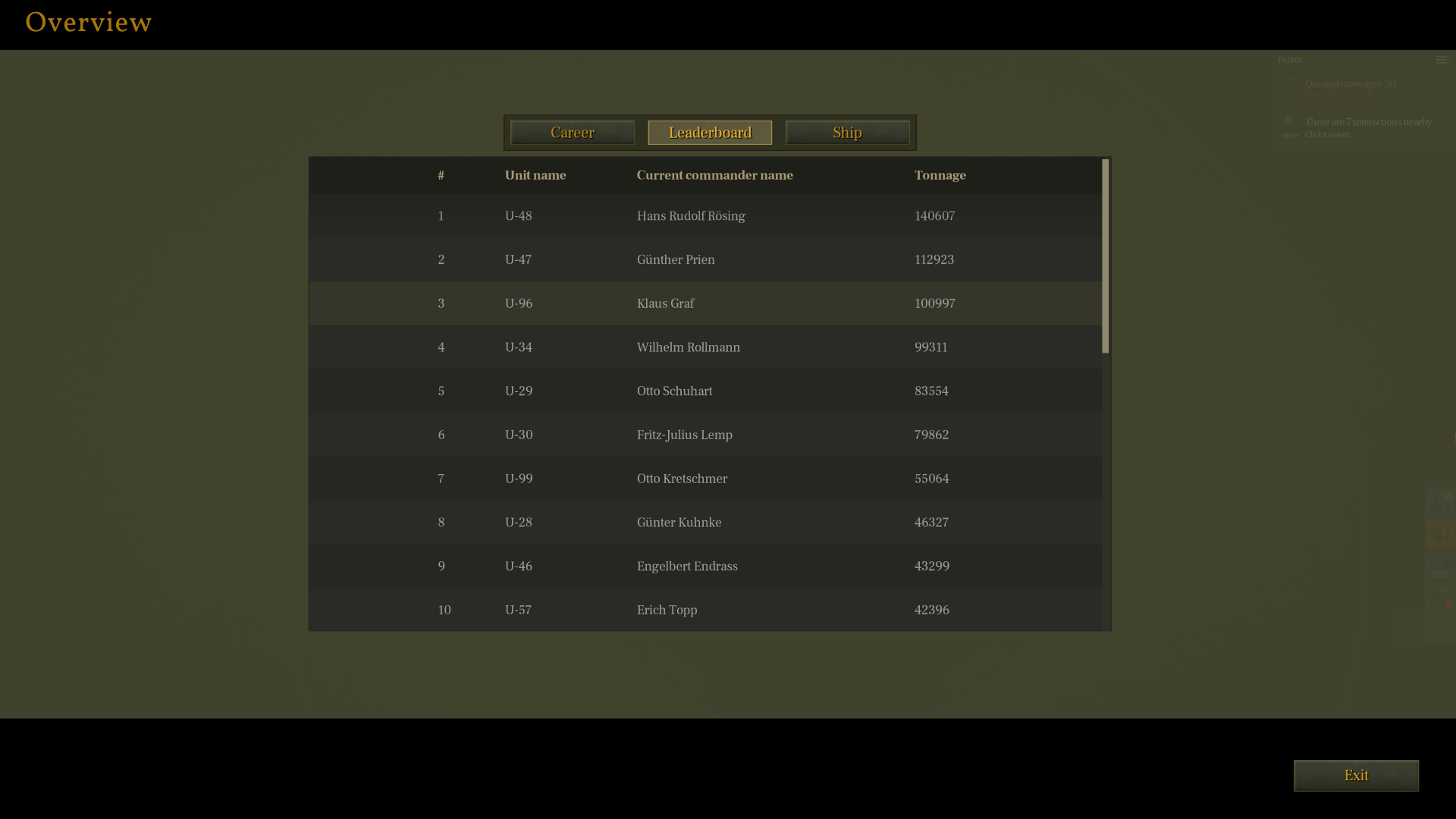 There is also a historical leaderboard now in the game that allows you to compare your successes with those of historical commanders. This leaderboard is updated dynamically as the war continues, with the GRT totals of historical commanders increasing on the dates of their historical sinkings.