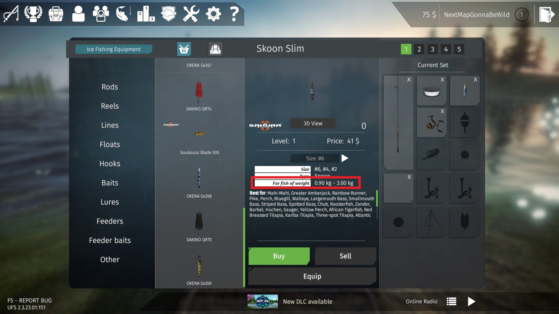 We added a few additional options that should help you play and catch the fish with proper fish sizes. One of them is to show the fish weight range based on hook size. To see the fish weight range - you need to own the lure/hook.