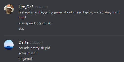 Ye, at the start there was a thought to make it epilepsy triggering game, but duh, we don't want to kill our players .--. so we decided to give up the epilepsy thingy and also decided to remove solving quick mafs part and leave only word typing.