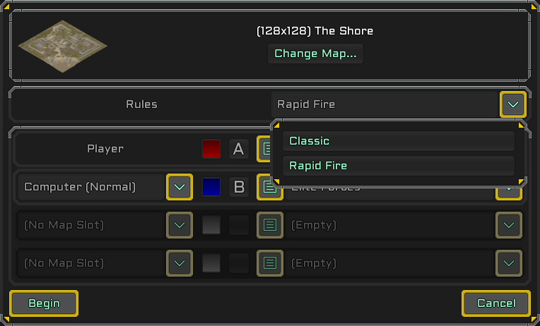 Rapid Fire rules increase all weapon ammo capacity by 10x. It is now the default rule-set for custom games. This change reduces unit micro-management which in turn makes the games feel much faster and action oriented. Try it out for yourself!