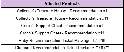 3. To Note ※ The relevant packages and products will only be sold until before the Dec. 19 (Thu) scheduled maintenance. ※ Collector's Recommendation/Croco's Recommendation Tickets and the accumulated 'Recommendation Bonus Points' will be removed after the Dec. 19 (Thu) scheduled maintenance.