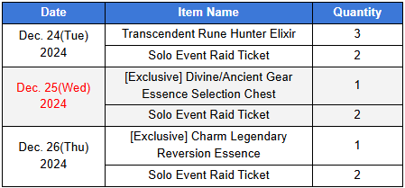 2. Maintenance Details 1) The 4th Void Rift rotation for Season Re:Birth will begin 2) Improvements and other changes will be made - The difficulty of the Holiday Event Raid's gameplay mechanics will be lowered. 3) New products and Holiday costumes will be added 4) Descent Raid Hard Mode monsters' levels will be increased from 130 to 145
