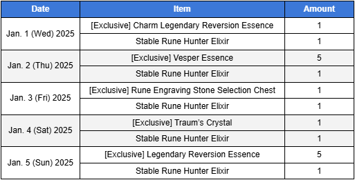 3. Compensation for the Issue - Gemstone of Courage x3,000 - Gold x300,000 - Croco's Precious Fragment x3 - Rune Hunter Coin x1,000 * You can obtain the compensation through your mailbox until Dec. 29 2024, 23:59 (UTC+9). * The compensation for the issue will only be sent once per account for both modes, and the mail will be stored for 3 days (72 hours). ┗ You can only obtain the compensation from either Standard or Season Mode. * The compensation can only be obtained by accounts created before the mail is sent. It cannot be obtained by accounts that were created after the mail has been sent.