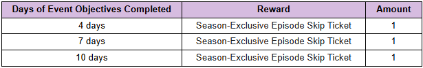 ■ To Note ※ The event rewards will be given in order after the Jan. 9 (Thu) 2025 scheduled maintenance, and when the conditions for higher tiers are met, the rewards for the lower tiers will also be given. ┗ Example: Complete 10 event objectives = 3 Episode Skip Tickets will be given. ※ The rewards will only be sent once per account, and the mail will be stored for 3 days (72 hours). ┗ The Pre-celebration Event rewards can only be obtained in Season Mode. ※ The number of event objectives completed will be calculated per account. Even if two or more characters in one account complete an objective, it will be counted as one character completing the objective. ※ The Episode Skip Ticket rewards can be used only during this Season, so please use them during the Season. ※ If you use an Episode Skip Ticket, you will not be listed on the [Season] Content Progress ranking.