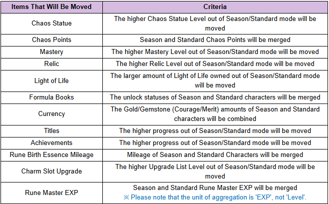 Your Relic Level and EXP, and any Light of Life that you own, will be combined based on whichever values are higher out of Season/Standard mode.