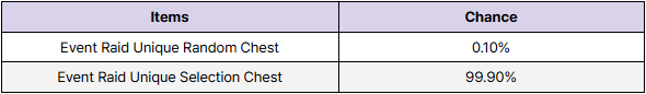 ■ Event Raid Unique Random Chest Contents - You can get 1 of the following items according to chance if you use Event Raid Unique Random Chest.