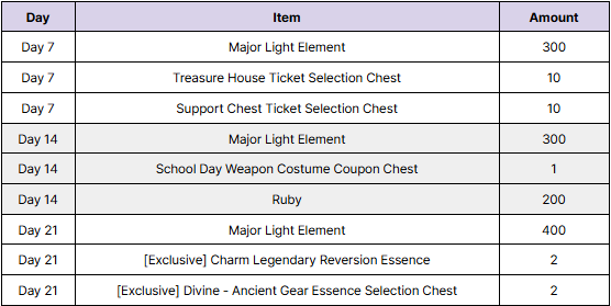 ■ To Note ※ The period and details outlined above may be subject to change. ※ The attendance information is refreshed every day at 9:00 (UTC+9). ※ You must obtain your rewards directly yourself, and obtained rewards will be sent to your bag. ※ Please ensure that you obtain any activated level rewards before the period ends. ※ You can see the contents of Chest items through [🔍View Info] in the item’s tooltip in the game.