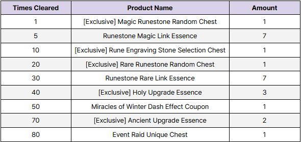 ■ Event Raid Clear Rewards - You can obtain following rewards based on the number of 'Gift King Puru' raid clears.