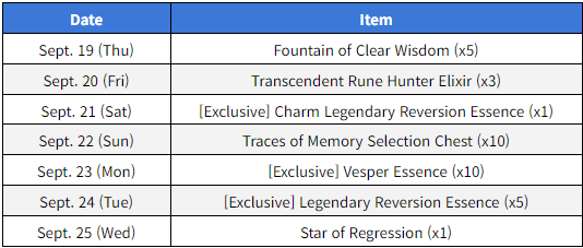 2. Maintenance Details 1) Normal/Royal Monthly Attendance for September will end and Normal/Royal Monthly Attendance for October will begin - Normal/Royal Monthly Attendance for September will end and Normal/Royal Monthly Attendance for October will begin on Oct. 1 (Tue) 09:00 (UTC+9). ※ Please remember to claim all Attendance Rewards by Oct. 1 (Tue) 08:59 (UTC+9). 2) The 6th Void Rift rotation for Season 5 will begin 3) The 6th Descent Raid rotation for Season 5 will begin - Descent Raid Hard Mode monsters' levels will be increased from 145 to 155. 4) Improvements and other changes will be made - Issue where incorrect Season 4 Unique items are occasionally dropped in Season 5 Hard Mode will be fixed. - 'Collector's Treasure House - Collector's Recommendation' and 'Croco's Support Chest - Croco's Recommendation' will be removed from Paid Shop. ※ Recommendation Tickets, Recommendation Ticket Chests, and Recommendation Draw Bonus Points will be removed after the maintenance so please use them during the event period. - Reward for disassembling 'Azure Fantasy Swimsuit Costume Coupon' and 'Beach Dazzle Swimsuit Costume Coupon' will change from Recommendation Tickets to 25 Mileage Tickets. ※ This change is caused by the end of sales of Collector’s/Croco’s Recommendation Products. If you wish to obtain and use Recommendation Tickets by disassembling Costumes, please do so before the maintenance.