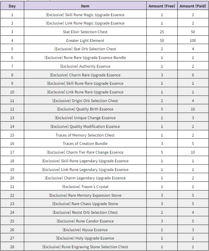 ■ To Note ※ You can obtain rewards through your mailbox by logging into the game every day (00:00-23:59 (UTC+9)) during the event period. ※ You must obtain your rewards directly from your mailbox, and obtained rewards will be sent to your bag. ※ The attendance reward mail will arrive by 23:59 (UTC+9) on the day the mail is sent. Rewards that are not obtained within the mail expiry time will expire and disappear. ※ The rewards will only be sent once per account, and the mail will be stored for 3 days (72 hours). ┗ You can only obtain the reward from either Standard or Season Mode. ※ Event rewards can only be obtained by accounts that were created before the event began and cannot be obtained by accounts that were created after the event began.