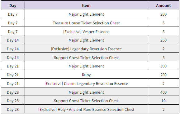 ■ Event Details - You can claim rewards through your mailbox by logging into the game every day during the 7-day event period. - You must obtain your rewards directly through your mailbox, and obtained rewards will be sent to your Bag. - The attendance reward mail will arrive by 23:59 (UTC+9) on the day the mail is sent.