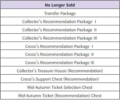 3. To Note ✔ The relevant packages and products will only be sold until before the Sept. 26 (Thu) scheduled maintenance. ✔ Products you have already purchased, except for Pass products, can still be used normally even after the sale of the product ends. ✔ Collector's Recommendation/Croco's Recommendation Tickets and Chests, and Recommendation Draw Bonus Points will be removed after the Sept. 26 (Thu) scheduled maintenance.