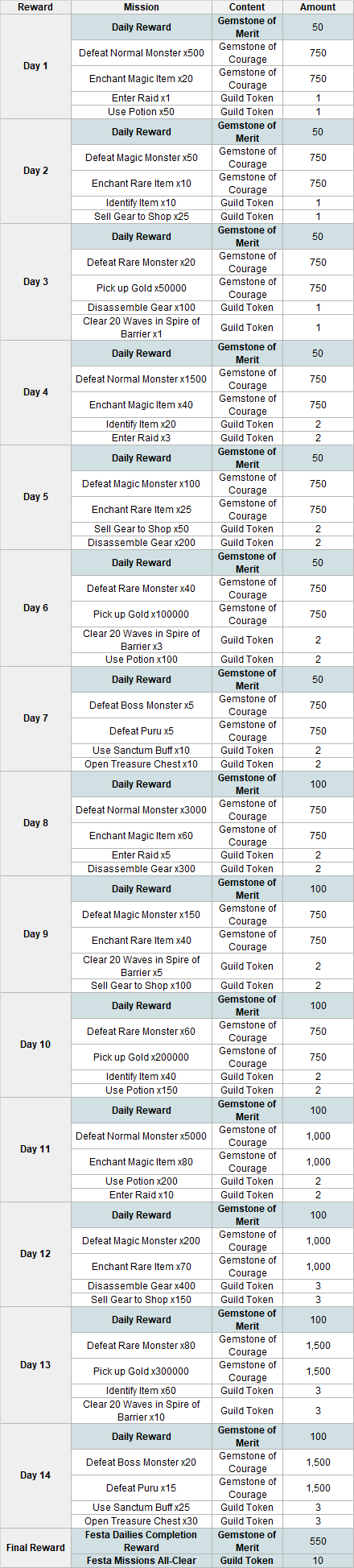 ■ Event Contents - Complete daily missions from Day 1 to 14 to collect rewards in-game. - You can proceed with the daily missions after receiving the daily reward. - You can still complete and receive rewards for missions from previous Days. - Received rewards will be sent to your Bag.