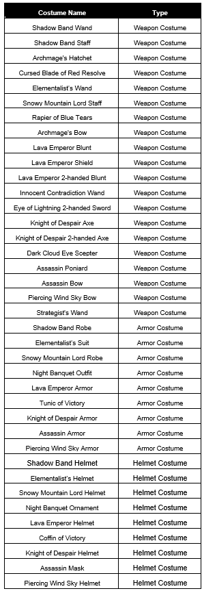 ✅ List of Costumes - The list of costumes below will be revealed in [Beauty → Costume]. - The costumes can be purchased with [Diamond] or [Costume Coupon].