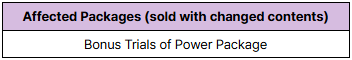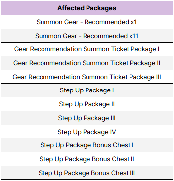 4. To Note ※ The relevant packages and products will only be sold until the dates above. ※ 'Gear Summon Tickets (Recommended)', 'Gear Summon Ticket (Recommended) Chests', and 'Bonus Points' accumulated in Summon Gear - Recommendation will be removed after the Feb. 20 (Thu) scheduled maintenance. ※ 'Lucky Summon Ticket Chests' that can be obtained from Step Up Package Bonus Chests Ⅰ - Ⅲ and Bonus Trials of Power Packages will be removed after the Feb. 20 (Thu) scheduled maintenance.