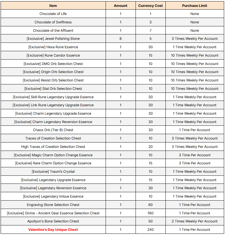 ■ To Note ※ The event schedule and rewards may be subject to change. ※ The Special Days of this Event are Saturday and Sunday during the event period. ※ The Gear that can be obtained from [Exclusive] items and event chests are untradeable. ※ You will not be able to use the following event items once the Event ends after the Mar. 6 (Thu) maintenance, so please ensure that you use the items before then. ※ Event items that are not used will disappear after the Mar. 6 (Thu) maintenance. - Puru's Chocolate Piece - Puru's Valentine's Day Gift Box - 3 Consumables at the Event Shop (Chocolate of Life, Chocolate of Swiftness, Chocolate of the Affluent) ※ Please make sure to not sell event items to the shop accidentally. ※ Event items may be given through other events.