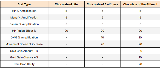 ■ Consumable Items Info - You can gain diverse advantageous effects for a certain time upon using Chocolate of Life, Chocolate of Swiftness, and Chocolate of the Affluent.
