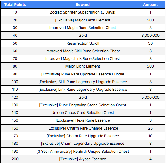 ■ Event Rewards ※ [3 Year Anniversary] Re:Birth Unique Selection Chest and [3 Year Anniversary] Traum's Unique Selection Chest obtained at 190 points and 360 points, and Unique Gear obtained from those chests are obtained bound to the character as 'Storage Unavailable', 'Untradeable' and 'Auction Registration Unavailable'.