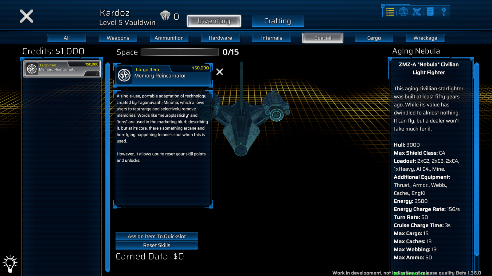 Added new skill reset items, single use objects that let you reset your skills anywhere. They’re rare drops from wrecks, quests, or able to be crafted at endgame levels for a high cost.