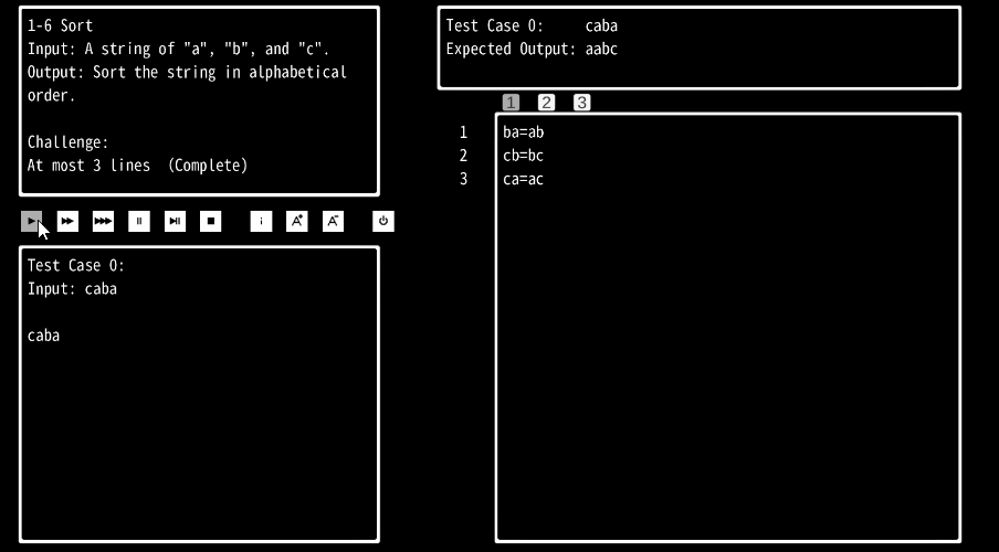 A=B is a programming puzzle game with only one instruction: A=B, which means replace A with B. In the game, you'll solve various problems with this minimalist language: From replace each letter with its uppercase, to multiply two binary numbers.