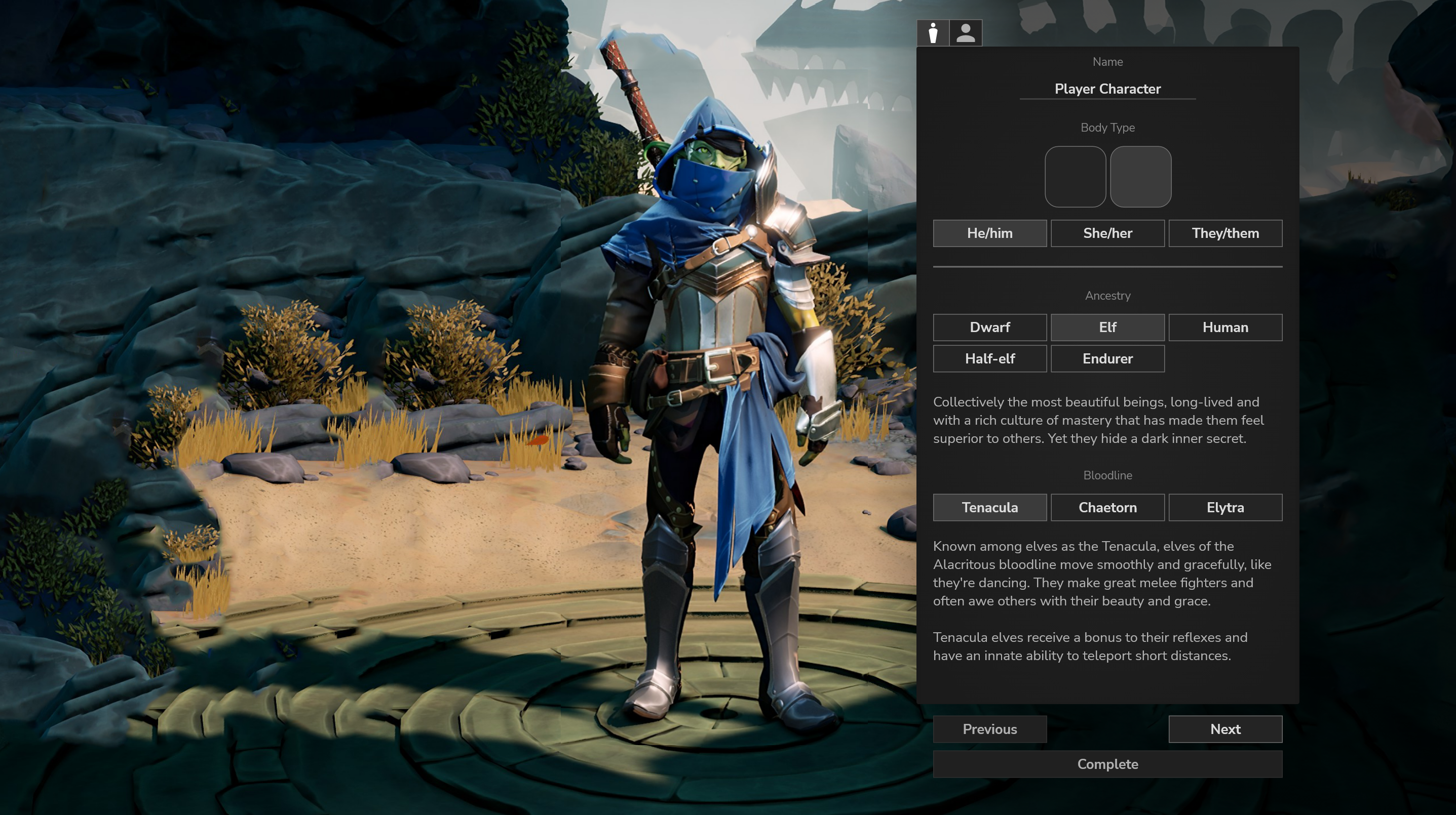 Once you’ve determined your ancestry and appearance, you’ll get the opportunity to share your origin story with a key NPC. Of course, if you’re playing the classic cloak-and-dagger, brooding-in-the-dark-corner-type, you’ll be able to decline sharing such personal details, and go straight to the finer details of character creation.