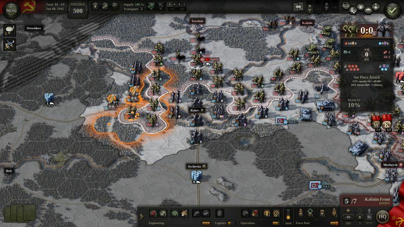 To get the most out of the Kalinin HQ abilities, specialists should be rearranged during battle preparation and front line troops should receive replacements by reorganizing rear units. Note that city terrain does not favor armor specialists and plan your dispositions accordingly.