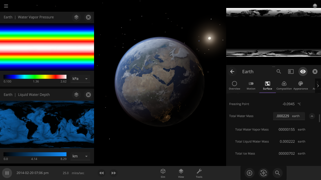 “Stabilize Temperature” and “Stabilize Phase” are two new surface simulation functions in an object’s Property panel. Instantly set the temperature of the surface or the phase of the water (gas, liquid, or solid ice) to their steady state. This is useful to see how a planet will settle over time, rather than needing to speed up time.