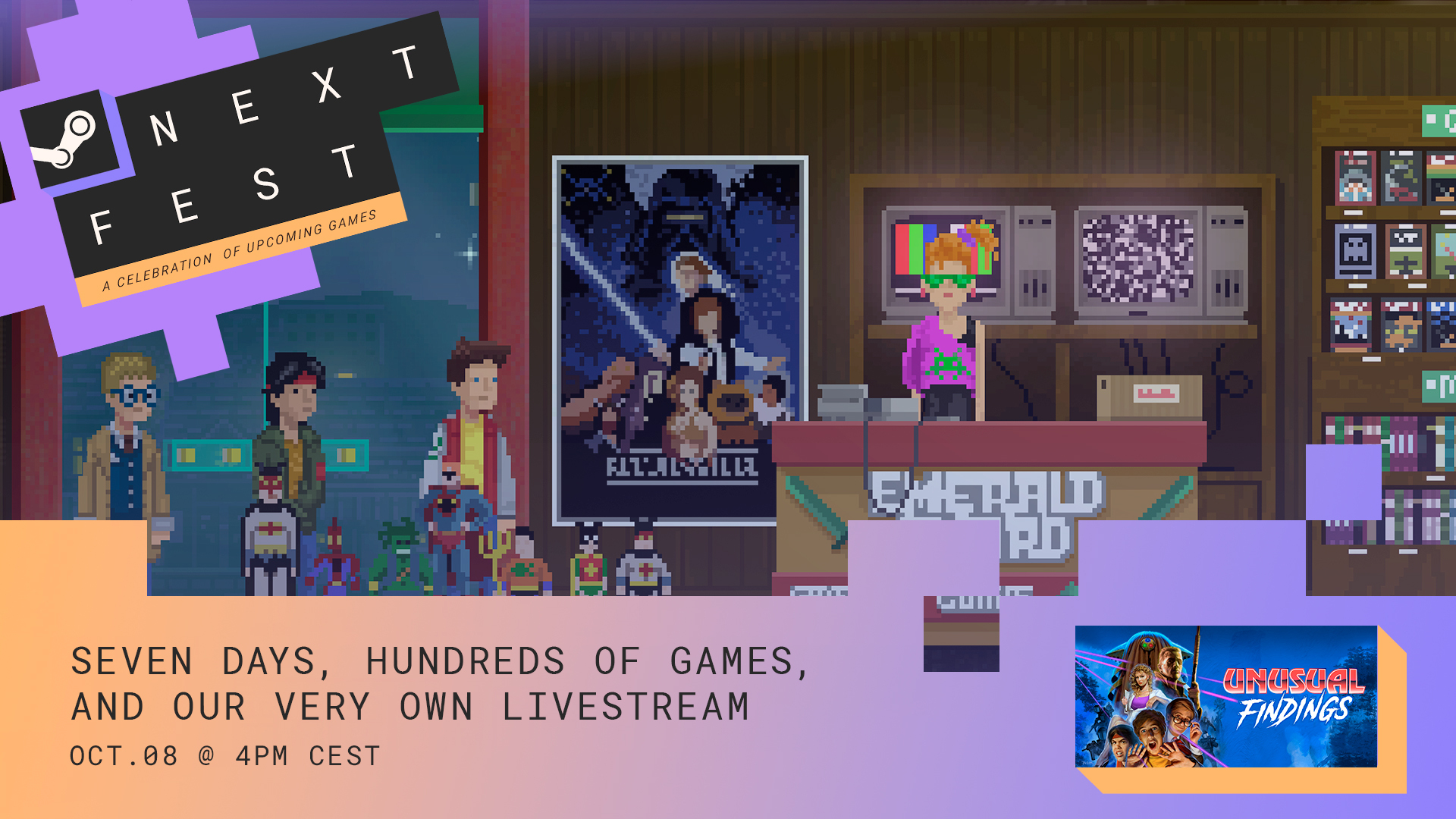 Steam Next Fest is literally in high gear this week, and we continue to do our part with our second stream of Unusual Findings. We'll start on October 8 at 4 PM CEST / 7 AM PST! Come to our stream and be ready for a surprise in the streaming chat! Don't miss a present for you or your friends!
