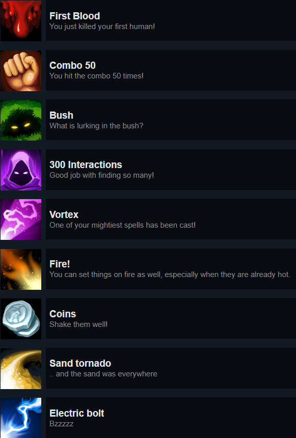 18 achievements are now available and more will be coming. There is something for everyone, be it a new player just getting into becoming the evil Urban Mage or a seasoned player aiming to beat the highest community score!