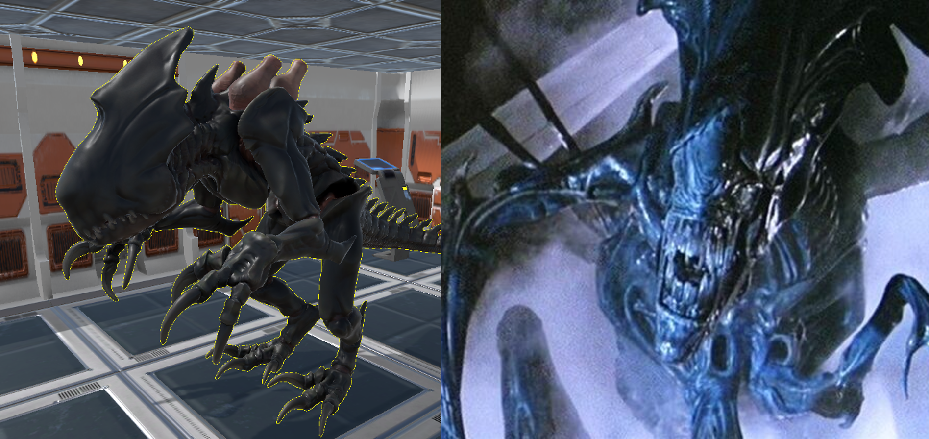 Left: Screenshot in-game of the Reaper in USC: Counterforce Right: Image of the movie Aliens (1986) by James Caron, from the Dread Central website