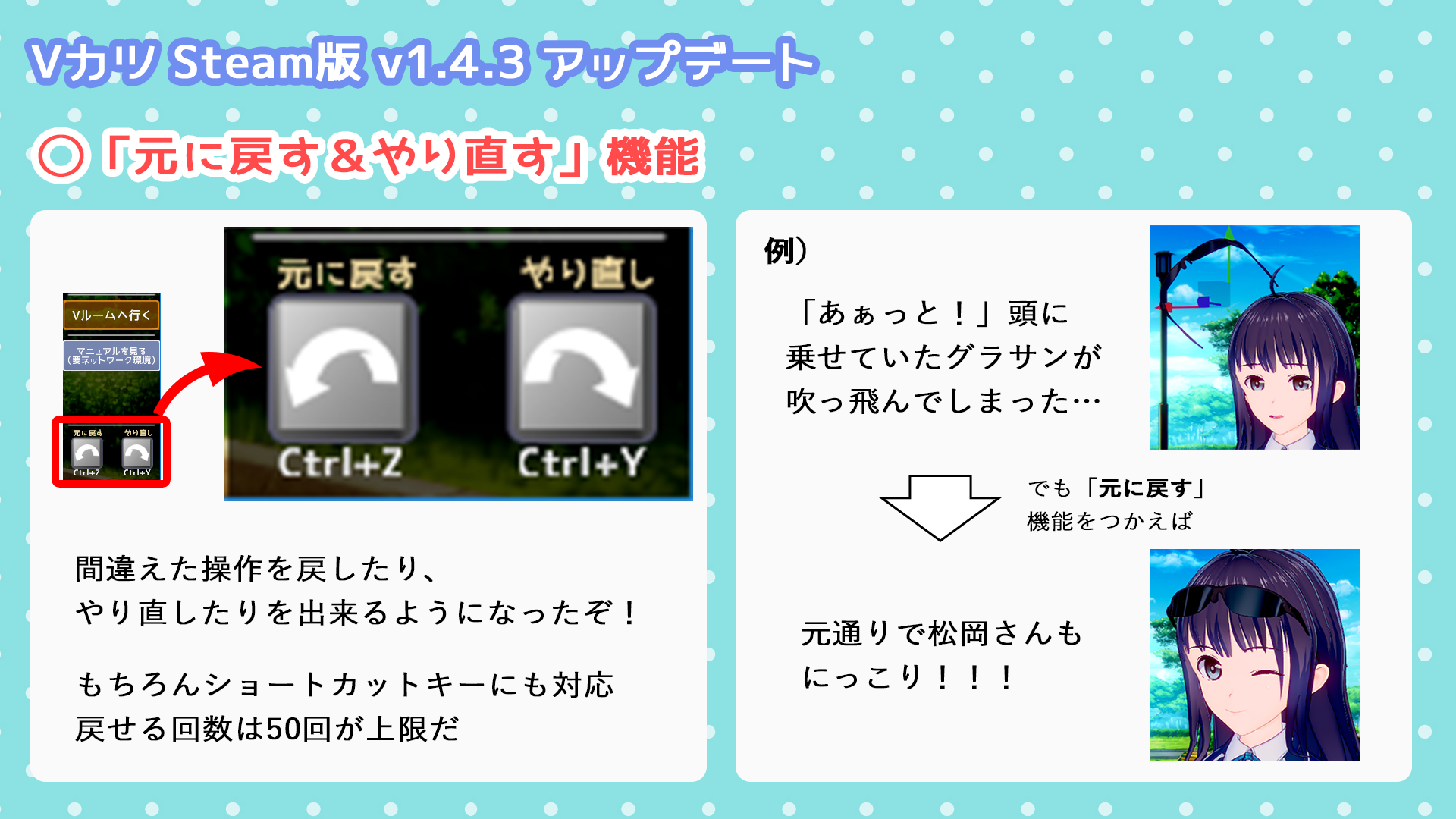 配信停止まで残りわずかな期間となりますが、引き続き『Vカツ』をお楽しみいただけますと幸いです。 VカツSteamベータ版(1.5.8)を公開いたしました。