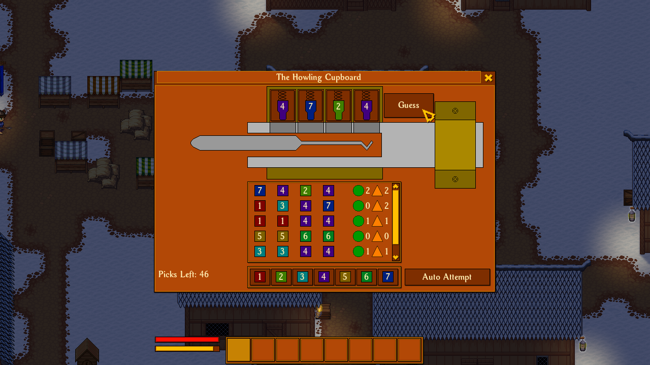 The lockpicking mini-game is a code-breaking game similar to Mastermind. You will have to guess the type of the pins to open the lock. Each time, an attempt fails, you risk breaking your lockpick. If you are not into logic games, you can use the "Auto Attempt" button to get a random chance to open the lock.