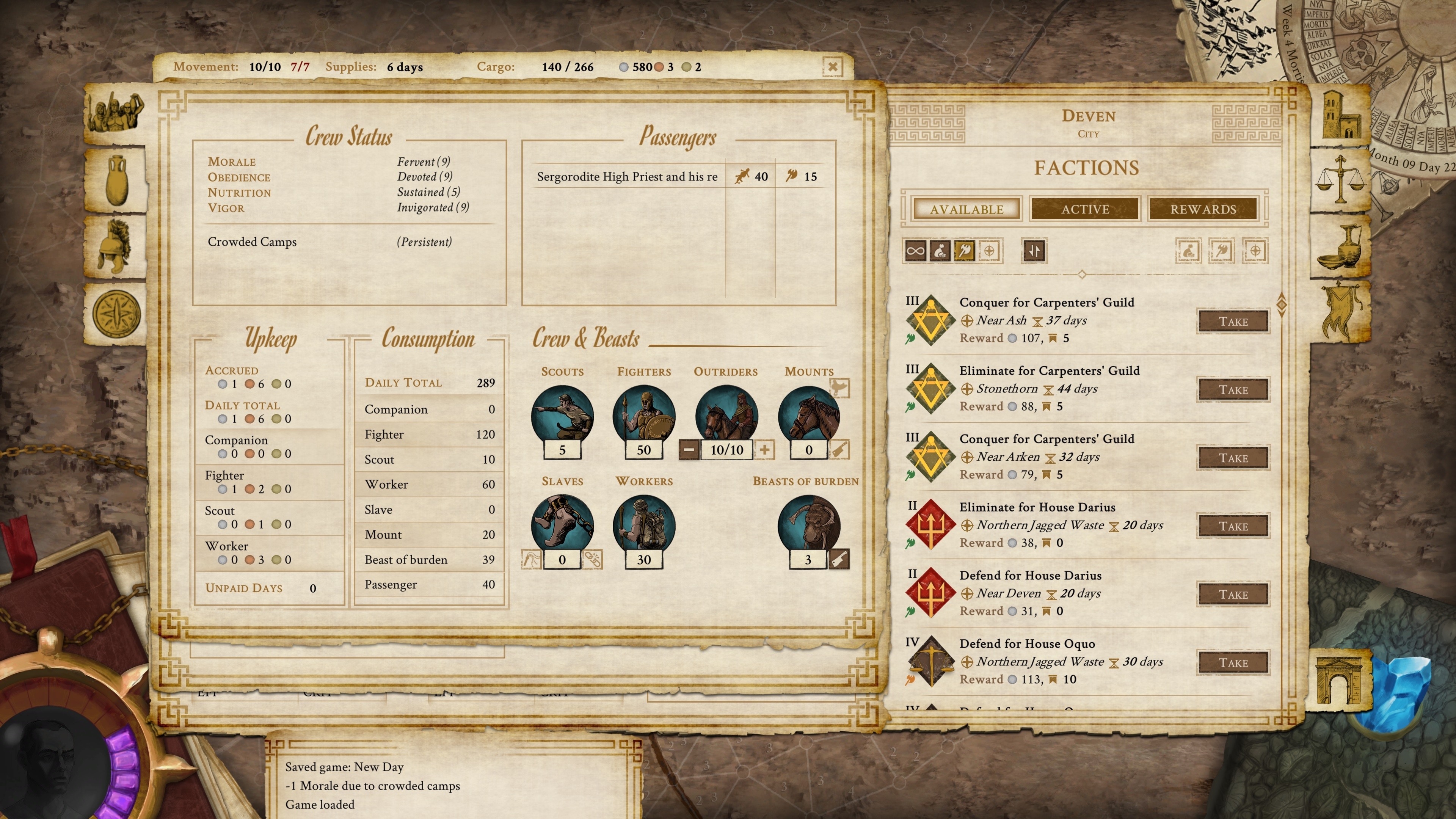 Apart from fitting the setting of the game, the point of this design is to keep smaller comitati more viable through normal market trading while to upkeep larger ones you would have to progress through factions. This is only true of course if the player wishes to delve into the trading aspect. Trade Tasks remain for those who mostly care about a fixed, certain profit without risking their coins.