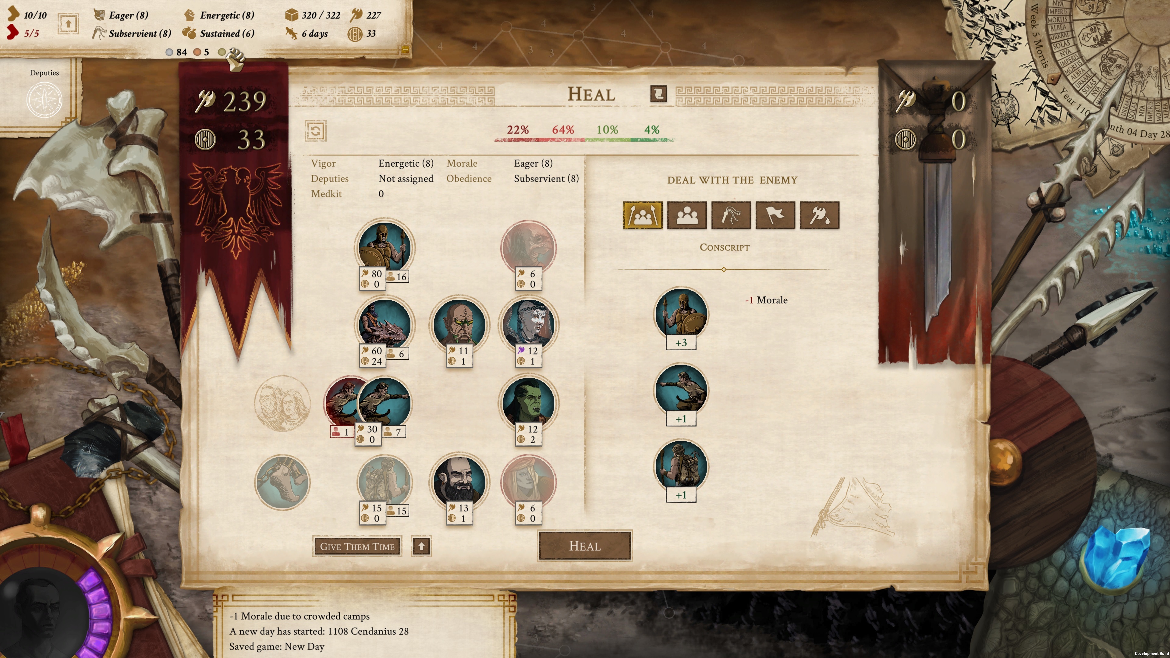 Another big change that comes with this build is Dissonance Mode, which you can select when starting a new game from now on. While based on our statistics (thanks to everyone for ticking the box!), the vast majority of players gets the hang of the game after a few botched trials, there are others who are looking for a more relaxed experience. Dissonance Mode is still not 'easy', so we try to avoid calling it an Easy Mode, nor is it a Story Mode since it is the cruel story itself that is left unsupported by the more lenient gameplay, but still, it's something along those lines, easing up on the management and combat mechanics so that you are less likely to be wiped out during a playthrough. Note that Achievements will be disabled in Dissonance Mode.